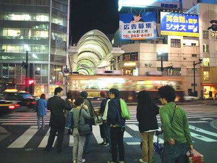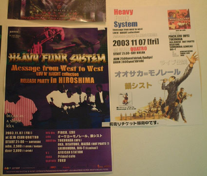 休憩終わって、次は、今回のヘヴィファンのPRでインストアDJをさせて頂けるHMVへ。まずは控室に通される。置いてあるロッカーは、過去にインストアで訪れたアーティストのサインやシールでびっしり埋まっていた。モノレールのシールもあって、中田さんのサインが入ってました(^^;)。HMVの担当の方とご挨拶し、早速ステージへ向かう。まだセッティングが出来ていなかったので、お手伝いしながらセッティング、音出しやら音質調整を行って準備完了。インストアDJは、18時からなので、軽く夕食を食べようということで、マクドナルドのハンバーガーと缶コーヒーで済ます。で、インストアDJは、ちょっと押して18時半くらいからスタート。泉井さん、ピンチさんの順番で、"MESSAGE FROM WEST TO WEST"(LUV 'N' HAIGHT COLLECTION)からの曲も織り交ぜながらのプレイ。今回は、ヴィデオカメラを持って来ていたので、聞きながら撮影する。翌日のヘヴィファンでもプレイする徳永さんや、そのお友達などが駆けつけて、いい感じでした。通りかかったある女性の方は、曲が気に入ったらしく、明日のパーティに行きたいということで予約をしておりました。1時間くらいで終了。簡単に後片づけしてからHMVの方に挨拶して食事に行くことにする。途中、市電を発見。仙台にも昔、市電があって、子供の頃は家の前を走っており、私はそれを見ながら育ったので懐かしい。